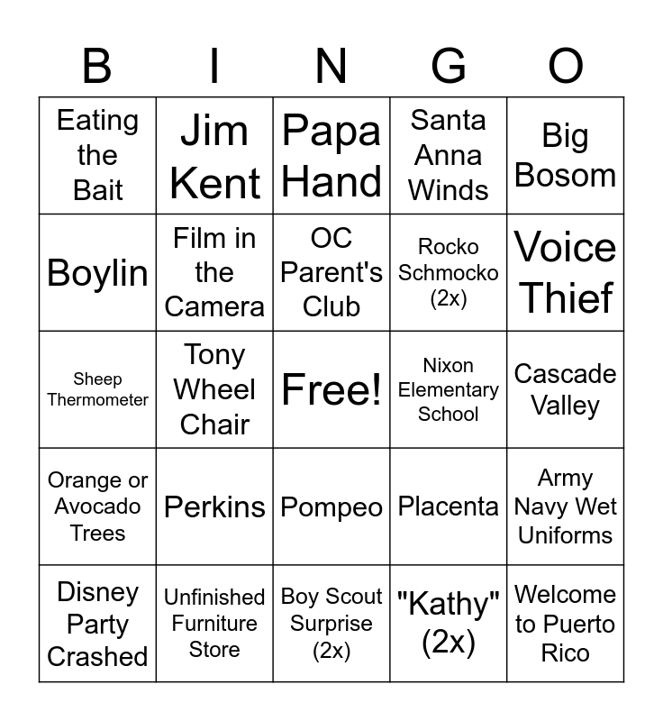 This bingo card has a free space and 24 words: Perkins, Unfinished Furniture Store, OC Parent's Club, Disney Party Crashed, Big Bosom, Eating the Bait, Boylin, Jim Kent, Nixon Elementary School, Pompeo, Rocko Schmocko (2x), Sheep Thermometer, Placenta, Army Navy Wet Uniforms, Film in the Camera, "Kathy" (2x), Cascade Valley, Papa Hand, Voice Thief, Tony Wheel Chair, Welcome to Puerto Rico, Orange or Avocado Trees, Santa Anna Winds and Boy Scout Surprise (2x).