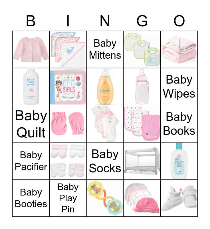 This bingo card has 24 images, a free space and 25 words: Baby Bottle, Baby Wipes, Baby Booties, Baby Rattle, Baby Socks, Baby Pacifier, Baby Towels, Baby Wash Cloths, Baby Powder, Baby T-Shirts, Baby Play Pin, Baby Bibs, Baby Onesies, Baby Lotion, Baby Books, Baby Diapers, Baby Bassinet, Baby Shampoo, Baby Burp Cloths, Baby Blanket, Baby Quilt, Baby Mittens, Baby Hats, Baby Sweater and Baby Monitor.