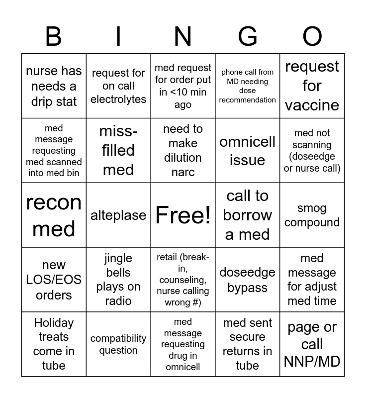 This bingo card has a free space and 30 words: compatibility question, Mariah Carey plays on the radio, alteplase, temperature/pressure alarm, nurse has needs a drip stat, med request for order put in <10 min ago, miss-filled med, retail (break-in, counseling, nurse calling wrong #), call to borrow a med, med message requesting drug in omnicell, smog compound, page or call NNP/MD, med sent secure returns in tube, omnicell issue, med not scanning (doseedge or nurse call), pager goes off, doseedge bypass, new LOS/EOS orders, jingle bells plays on radio, request for vaccine, recon med, status board clear, request for on call electrolytes, omnicell issue, med message requesting med scanned into med bin, phone call from MD needing dose recommendation, med message for adjust med time, Holiday treats come in tube, need to make dilution narc and someone on phone gives seasons greetings.