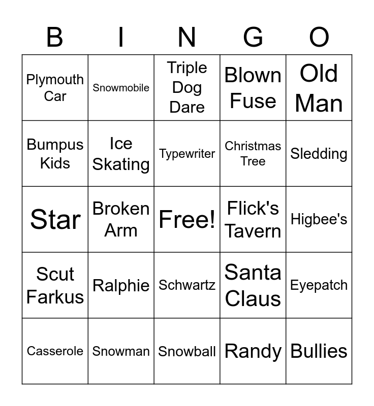 This bingo card has a free space and 25 words: Ralphie, Snowball, Typewriter, Casserole, Old Man, Plymouth Car, Bumpus Kids, Snowmobile, Flick's Tavern, Schwartz, Christmas Tree, Star, Santa Claus, Eyepatch, Ice Skating, Crutches, Higbee's, Triple Dog Dare, Sledding, Broken Arm, Bullies, Snowman, Scut Farkus, Blown Fuse and Randy.