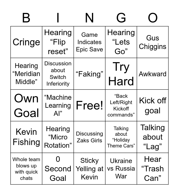 This bingo card has a free space and 46 words: Hear a “GASP”, Hear “Trash Can”, Zak Praises Himself, Sticky Yelling at Kevin, Hearing “Micro Rotation”, Yelling “Jonathan”, Hearing “Flip reset”, Caitlin Tailgating or Flying, Hearing “Meridian Middle”, “Everyone Back to Main”, Discussion about Switch Inferiority, Hearing “Lets Go”, Talking about “Lag”, Talking about “Holiday Theme Cars”, Talking about Controller issues, Talking about fully wired inputs, “Faking”, “Back Left/Right Kickoff commands”, “Laniel”, Gus Chiggins, “Machine Learning AI”, Ukraine vs Russia War, Cringe, Try Hard, Sweaty, Awkward, Whole team blows up with quick chats, Discussing Treys Girls, Discussing Zaks Girls, Kevin Fishing, Smoking or Eating Weed, “Rotate”, Vote to concede, Rule 1, Open Net Miss, 0 Second Goal, Kick off goal, Brazil scoreline, Game Indicates Pool Shot, Game Indicates Turtle Shot, Game Indicates Aerial Goal, Game Indicates Epic Save, Own Goal, “Toxic”, Try Hard and Unlucky.