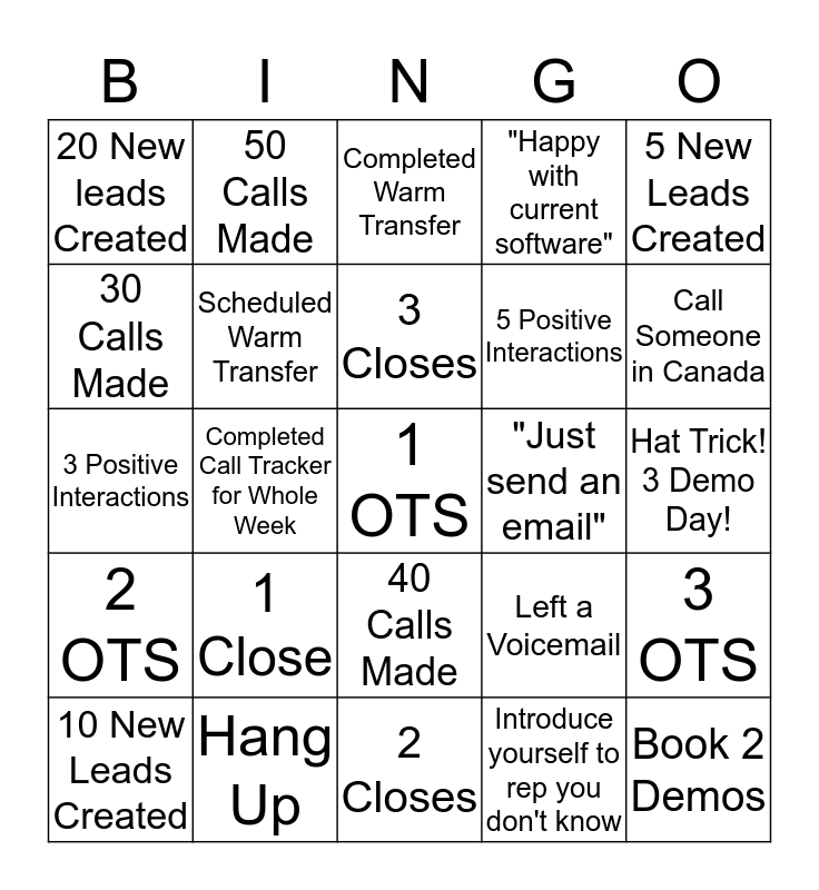 This bingo card has 25 words: 1 Close, 2 Closes, 3 Closes, 10 New Leads Created, 5 New Leads Created, 20 New leads Created, 30 Calls Made, 50 Calls Made, "Just send an email", 40 Calls Made, 5 Positive Interactions, 3 Positive Interactions, Left a Voicemail, 3 OTS, Scheduled Warm Transfer, Book 2 Demos, Hat Trick! 3 Demo Day!, Completed Warm Transfer, Call Someone in Canada, Completed Call Tracker for Whole Week, 1 OTS, Hang Up, 2 OTS, "Happy with current software" and Introduce yourself to rep you don't know.