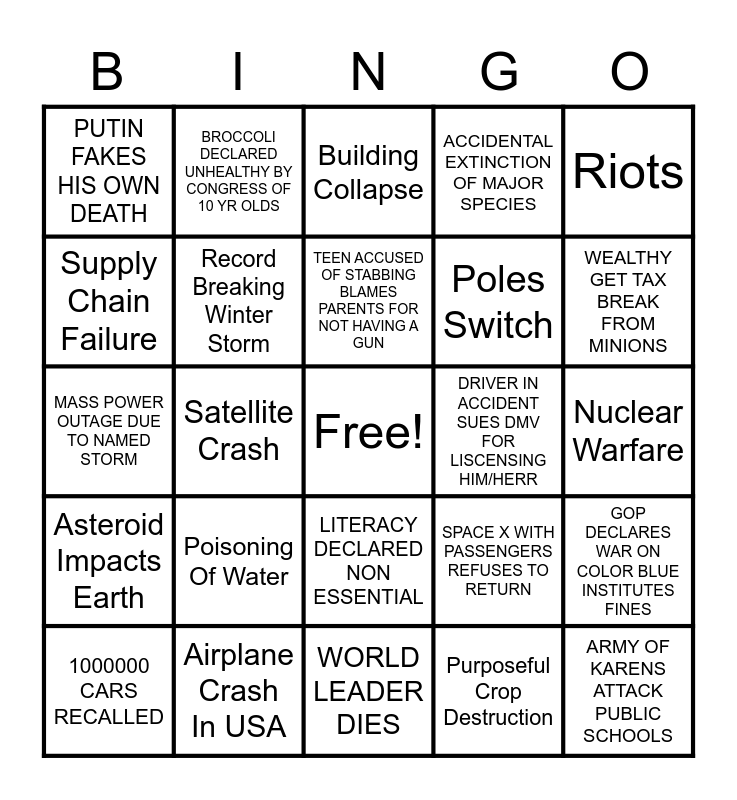 This bingo card has 40 words: Wildfire Anywhere But California, MASS POWER OUTAGE DUE TO NAMED STORM, Mass Shooting, Record Breaking Winter Storm, Airplane Crash In USA, LITERACY DECLARED NON ESSENTIAL, TEEN ACCUSED OF STABBING BLAMES PARENTS FOR NOT HAVING A GUN, RECALL OF BIRD FLU INFECTED CHICKENS, Riots, Asteroid Impacts Earth, Satellite Crash, ACCIDENTAL EXTINCTION OF MAJOR SPECIES, Free!, Nuclear Warfare, DRIVER IN ACCIDENT SUES DMV FOR LISCENSING HIM/HERR, Poisoning Of Water, Flood, PUTIN FAKES HIS OWN DEATH, Earthquake, Building Collapse, GOP DECLARES WAR ON COLOR BLUE INSTITUTES FINES, Purposeful Crop Destruction, Poles Switch, Supply Chain Failure, JANUARY 6 ATTACKS NOW BLAMED ON ZOMBIES, Terrorists Bombing, SUPREME COURT SUSPENDS CONSTITUTION, New Covid Strain, ARMY OF KARENS ATTACK PUBLIC SCHOOLS, Hazmat Disaster, DOMESTIC TERRORISM ATTACK ON POWER GRID, 1000000 CARS RECALLED, APPLETON LIBRARY PLANS SCRAPED, SPACE X WITH PASSENGERS REFUSES TO RETURN, WEALTHY GET TAX BREAK FROM MINIONS, WORLD LEADER DIES, FENTANYL OVERDOSE DEATHS IN NURSING HOME, MAJOR ACCIDENT ON 41/441, BROCCOLI DECLARED UNHEALTHY BY CONGRESS OF 10 YR OLDS and WISEMEN ORDERED TO STAY HOME/ WE HAVE ENOUGH.