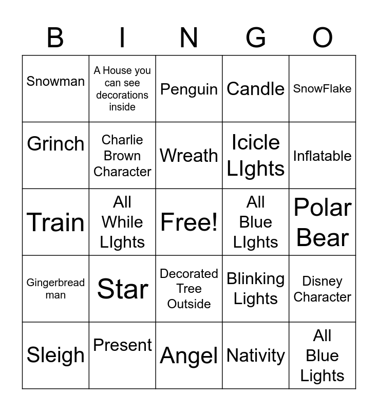 This bingo card has a free space and 29 words: Sleigh, Decorations on the Roof, All While LIghts, Santa, Snowman, Penguin, Charlie Brown Character, Star, All Blue LIghts, Present, Polar Bear, All Blue Lights, Angel, Nativity, Inflatable, Projector LIghts, Decorated Tree Outside, Gingerbread man, SnowFlake, Train, Blinking Lights, Reindeer, Icicle LIghts, Grinch, Candle, A House you can see decorations inside, Disney Character, Wreath and Wise Men.
