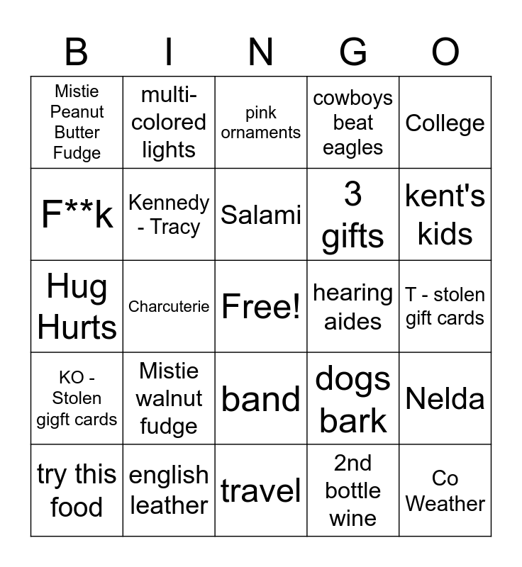 This bingo card has a free space and 24 words: Mistie walnut fudge, english leather, Salami, try this food, College, Mistie Peanut Butter Fudge, F**k, multi-colored lights, hearing aides, band, 3 gifts, Hug Hurts, dogs bark, Nelda, Kennedy - Tracy, 2nd bottle wine, T - stolen gift cards, pink ornaments, kent's kids, Charcuterie, Co Weather, KO - Stolen gigft cards, cowboys beat eagles and travel.