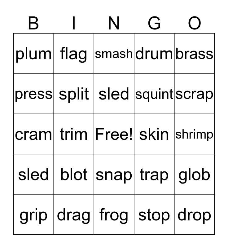 This bingo card has a free space and 24 words: blot, drag, sled, grip, brass, plum, press, flag, skin, snap, squint, cram, trap, glob, split, stop, shrimp, smash, scrap, trim, drop, sled, drum and frog.