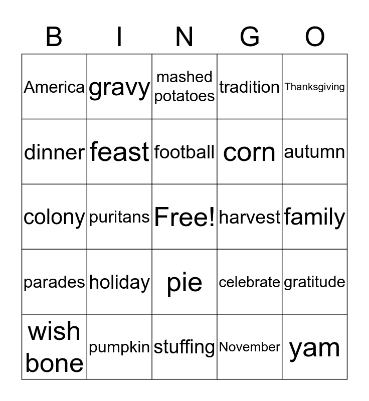 This bingo card has a free space and 24 words: holiday, pumpkin, football, wish bone, Thanksgiving, America, dinner, gravy, harvest, pie, corn, colony, celebrate, gratitude, feast, November, family, mashed potatoes, autumn, puritans, yam, parades, tradition and stuffing.