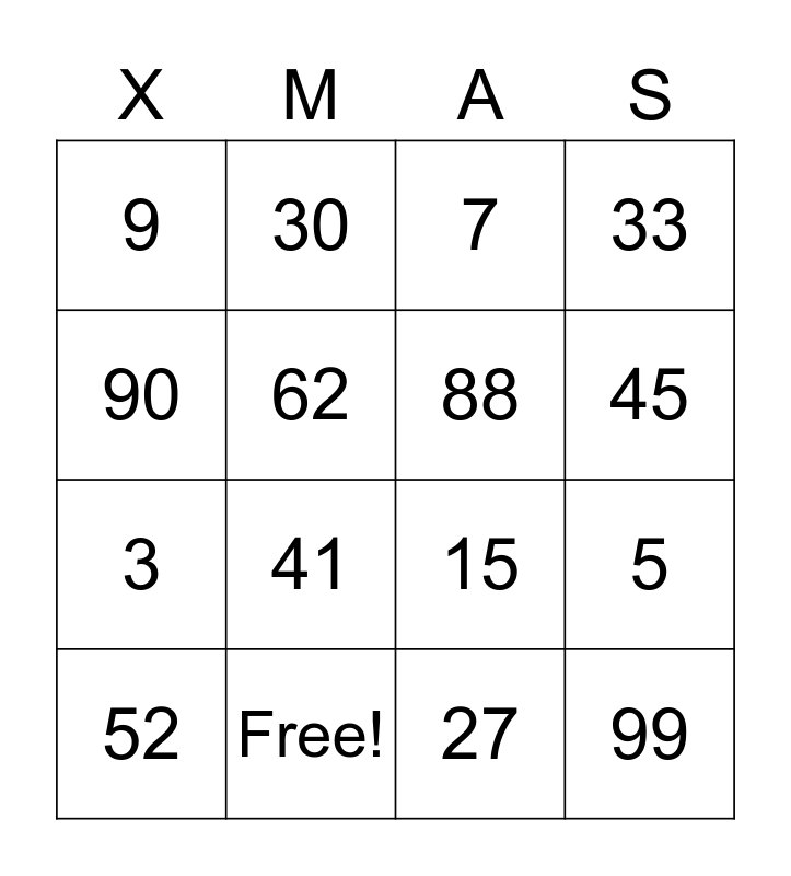 This bingo card has 16 words: Free!, 5, 7, 9, 3, 30, 15, 27, 90, 62, 52, 33, 41, 45, 88 and 99.