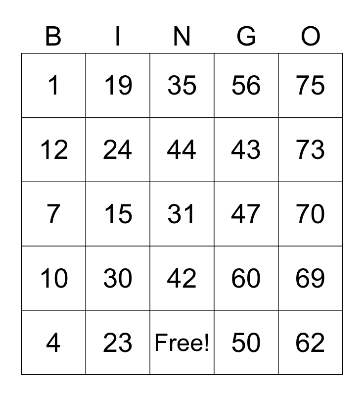 This bingo card has 25 words: 10, 23, 31, 50, 75, 1, 19, 35, 47, 69, 12, 24, Free!, 60, 73, 4, 15, 44, 43, 70, 7, 30, 42, 56 and 62.