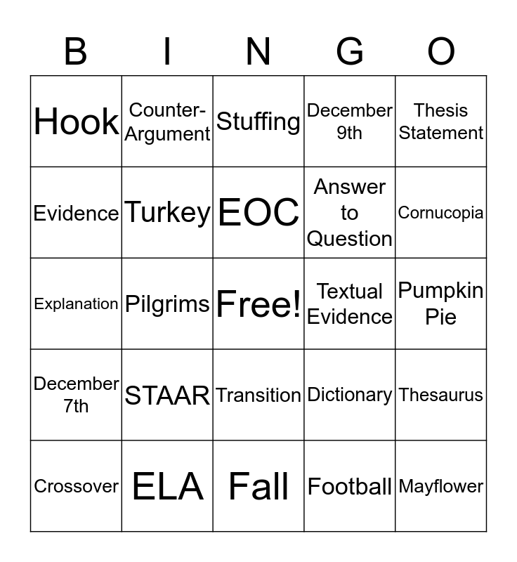This bingo card has a free space and 24 words: STAAR, ELA, EOC, Crossover, Thesis Statement, Hook, Evidence, Counter- Argument, Textual Evidence, Transition, Answer to Question, Explanation, Dictionary, Thesaurus, Turkey, Football, Pumpkin Pie, Stuffing, Cornucopia, Pilgrims, Mayflower, December 7th, December 9th and Fall.