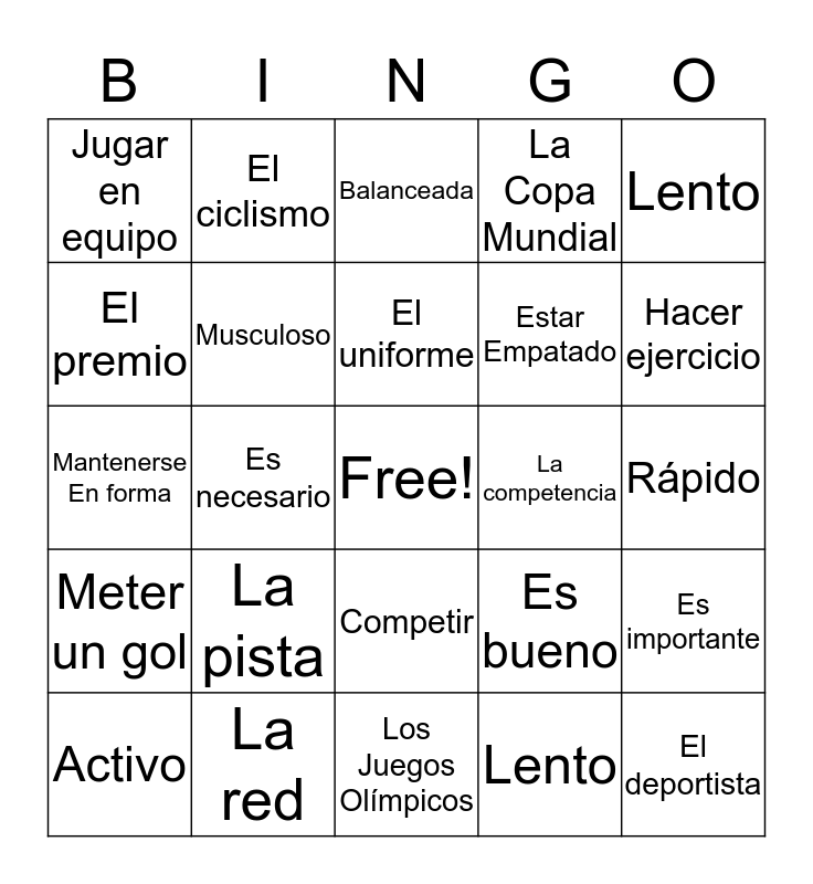 This bingo card has a free space and 24 words: La pista, La red, El uniforme, Activo, Lento, Jugar en equipo, El premio, El ciclismo, La competencia, Competir, Estar Empatado, Mantenerse En forma, Es bueno, Es importante, Musculoso, Lento, Rápido, Balanceada, Hacer ejercicio, Es necesario, El deportista, Meter un gol, La Copa Mundial and Los Juegos Olímpicos.