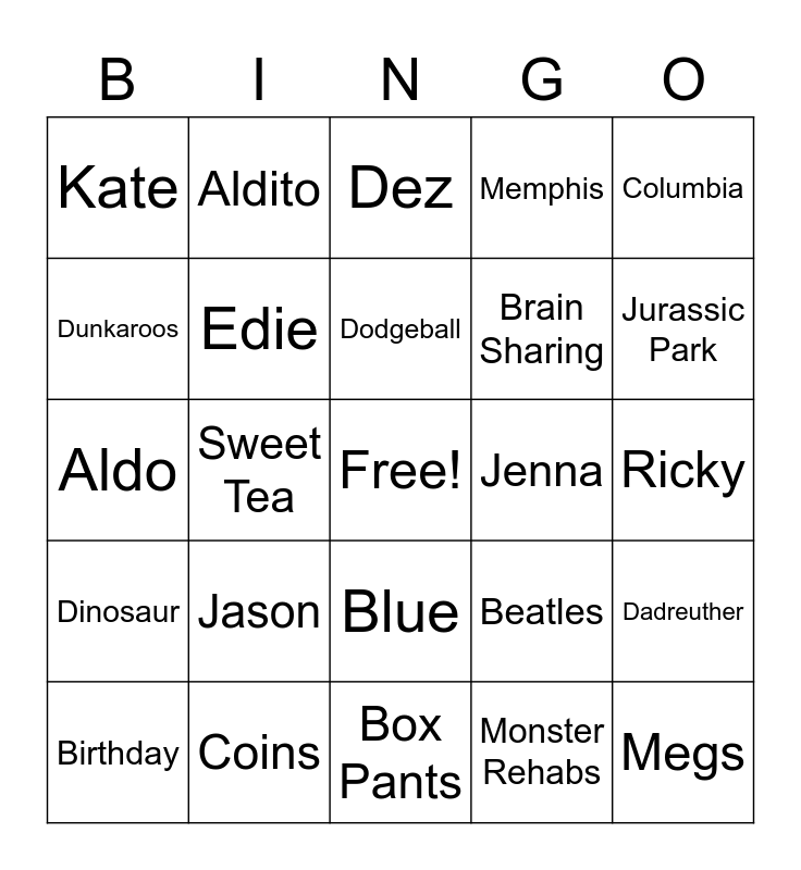 This bingo card has a free space and 40 words: Paige, Aldo, Zaida, Edie, Coins, Blue, Dodgeball, River, Columbia, Dinosaur, Sweet Tea, Memphis, Megs, Ricky, Jenna, Jason, Oreo McFlurry, Kate, Jasmin, Dez, Dadreuther, Monster Rehabs, Brain Sharing, Dunkaroos, Shooty Fruity, T-Rex, Reptar, Zoey, Corkys, Racist Grandma, Frogs, Birthday, BRZ, Beatles, Jurassic Park, Box Pants, Prosecco, Pizza, Aldito and Heated Gloves.