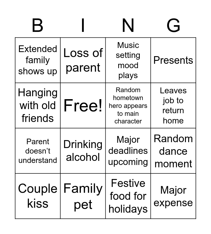 This bingo card has 16 words: Family pet, Random dance moment, Music setting mood plays, Extended family shows up, Parent doesn’t understand, Loss of parent, Major deadlines upcoming, Festive food for holidays, Hanging with old friends, Free!, Couple kiss, Presents, Drinking alcohol, Leaves job to return home, Random hometown hero appears to main character and Major expense.