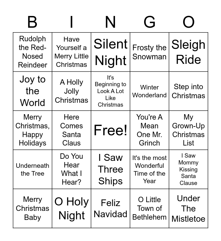 This bingo card has a free space and 36 words: Rockin' Around the Christmas Tree, All I Want For Christmas Is You, Jingle Bell Rock, A Holly Jolly Christmas, It's the most Wonderful Time of the Year, Underneath the Tree, It's Beginning to Look A Lot Like Christmas, Jingle Bells, Sleigh Ride, Christmas (Baby Please Come Home), Here Comes Santa Claus, Frosty the Snowman, Silver Bells, You're A Mean One Mr. Grinch, Step into Christmas, Rudolph the Red-Nosed Reindeer, Mary, Did You Know, Do You Hear What I Hear?, Under The Mistletoe, Silent Night, My Grown-Up Christmas List, I Saw Mommy Kissing Santa Clause, O Holy Night, Merry Christmas Baby, Feliz Navidad, Have Yourself a Merry Little Christmas, Merry Christmas, Happy Holidays, Wonderful Christmastime, Winter Wonderland, Joy to the World, I'll Be Home For Christmas, Away in a Manger, O Little Town of Bethlehem, I Saw Three Ships, O Come, O Come, Emmanuel and What Child Is This.