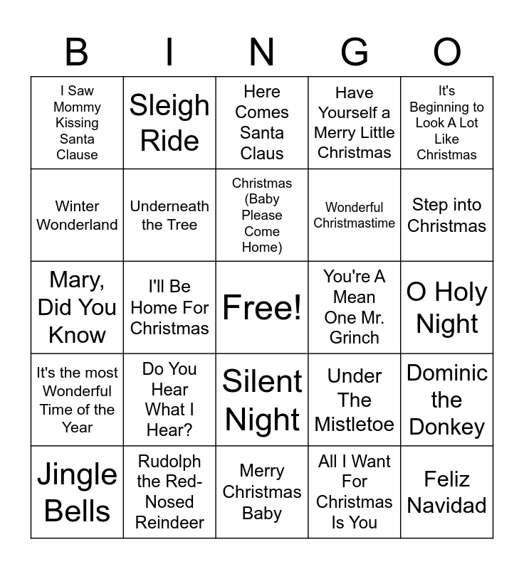 This bingo card has a free space and 34 words: Rockin' Around the Christmas Tree, All I Want For Christmas Is You, Jingle Bell Rock, A Holly Jolly Christmas, It's the most Wonderful Time of the Year, Underneath the Tree, It's Beginning to Look A Lot Like Christmas, Jingle Bells, Sleigh Ride, Let it Snow! Let it Snow! Let it Snow!, Christmas (Baby Please Come Home), Here Comes Santa Claus, Frosty the Snowman, Silver Bells, You're A Mean One Mr. Grinch, Step into Christmas, Rudolph the Red-Nosed Reindeer, Mary, Did You Know, Do You Hear What I Hear?, Under The Mistletoe, Silent Night, My Grown-Up Christmas List, I Saw Mommy Kissing Santa Clause, O Holy Night, Merry Christmas Baby, Feliz Navidad, Have Yourself a Merry Little Christmas, Merry Christmas, Happy Holidays, Wonderful Christmastime, Winter Wonderland, Joy to the World, I'll Be Home For Christmas, Dominic the Donkey and Gucci Christmas.