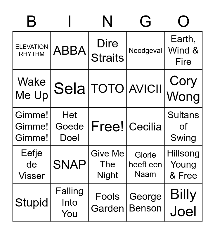 This bingo card has a free space and 36 words: Froukje, Merol, VOL, Sela, Glorie heeft een Naam, Eefje de Visser, TOTO, Sterren In De Nacht, Earth, Wind & Fire, Boogie Wonderland, Het Goede Doel, Noodgeval, Taylor Swift, Cecilia, Cory Wong, ELEVATION RHYTHM, IYKYK, SNAP, Billy Joel, Dire Straits, Sultans of Swing, Hillsong Young & Free, Falling Into You, Stupid, Fools Garden, ABBA, Gimme! Gimme! Gimme!, Mark Ronson & Bruno Mars, AVICII, Wake Me Up, WHAM!, A-HA, George Benson, Give Me The Night, Oleta Adams and Window Of Hope.