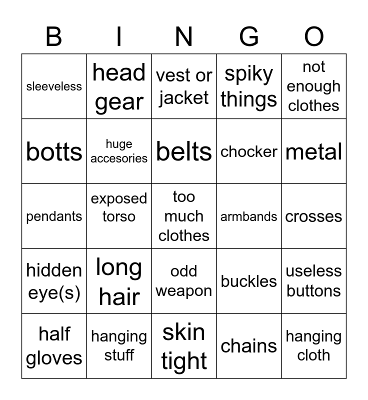 This bingo card has 25 words: long hair, skin tight, belts, half gloves, not enough clothes, sleeveless, botts, head gear, armbands, odd weapon, chocker, pendants, buckles, useless buttons, huge accesories, hanging cloth, crosses, vest or jacket, metal, exposed torso, too much clothes, hanging stuff, hidden eye(s), spiky things and chains.