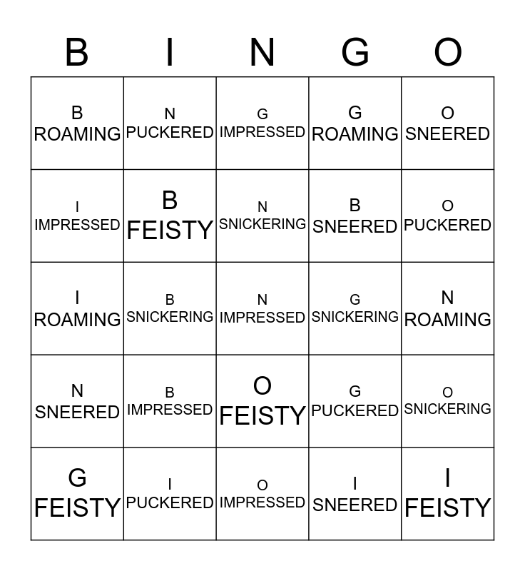 This bingo card has a free space and 24 words: B IMPRESSED, I PUCKERED, N SNICKERING, G FEISTY, O SNEERED, B ROAMING, I IMPRESSED, N PUCKERED, G SNICKERING, O FEISTY, B SNEERED, I ROAMING, G PUCKERED, O SNICKERING, B FEISTY, I SNEERED, N ROAMING, G IMPRESSED, O PUCKERED, B SNICKERING, I FEISTY, N SNEERED, G ROAMING and O IMPRESSED.
