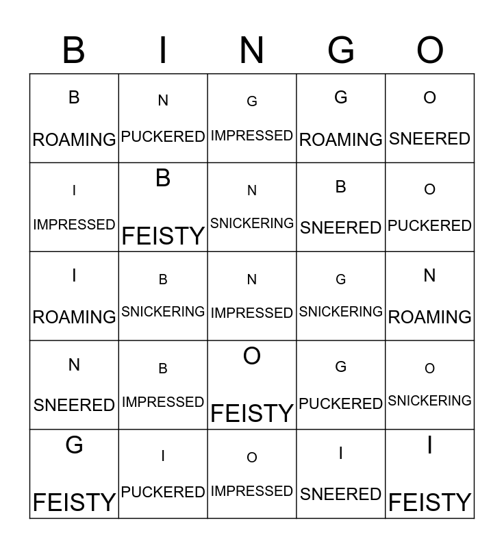 This bingo card has a free space and 24 words: B IMPRESSED, I PUCKERED, N SNICKERING, G FEISTY, O SNEERED, B ROAMING, I IMPRESSED, N PUCKERED, G SNICKERING, O FEISTY, B SNEERED, I ROAMING, G PUCKERED, O SNICKERING, B FEISTY, I SNEERED, N ROAMING, G IMPRESSED, O PUCKERED, B SNICKERING, I FEISTY, N SNEERED, G ROAMING and O IMPRESSED.
