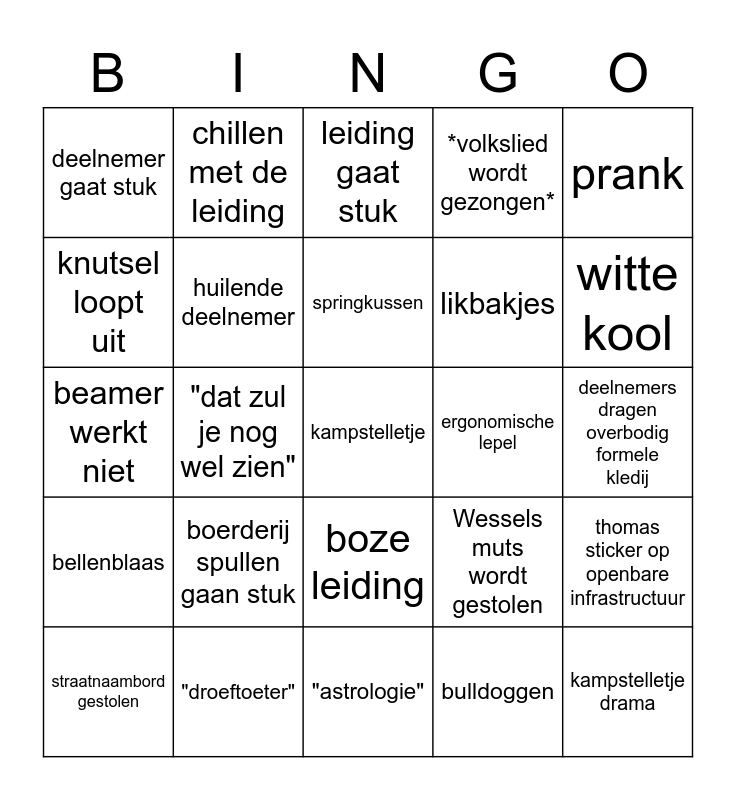 This bingo card has 30 words: "droeftoeter", "muts", "dat zul je nog wel zien", strafcorvee, deelnemer gaat stuk, leiding gaat stuk, huilende deelnemer, boze leiding, ergonomische lepel, "astrologie", deelnemers dragen overbodig formele kledij, kampstelletje, bulldoggen, kampstelletje drama, witte kool, vreemd thema item, Wessels muts wordt gestolen, bellenblaas, boerderij spullen gaan stuk, prank, beamer werkt niet, eten is veel te pittig, chillen met de leiding, likbakjes, knutsel loopt uit, *volkslied wordt gezongen*, thomas sticker op openbare infrastructuur, straatnaambord gestolen, springkussen and deelnemer komt >30 min te vroeg.