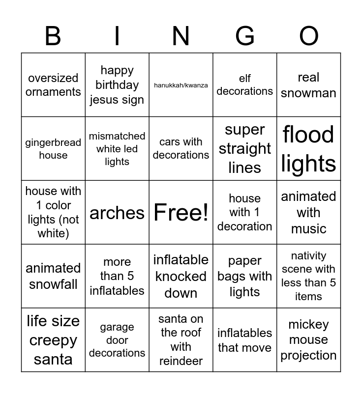 This bingo card has a free space and 47 words: nativity scene with camel, mickey mouse projection, leg lamp, santa on the roof with reindeer, more than 5 inflatables, wreath in every window, happy birthday jesus sign, inflatable character that has nothing to do with christmas, gingerbread house, star wars character, mismatched white led lights, elf decorations, nativity scene with less than 5 items, paper bags with lights, visible extension cords, snowflakes, cars with decorations, house with 1 decoration, chasing lights, real snowman, arches, inflatables that move, oversized ornaments, super straight lines, columns decorated with spirals, flood lights, life size creepy santa, lights falling down, inflatable knocked down, animated snowfall, tree with every branch decorated, shooting star, moving reindeer, each bush a different color, house completely outlined, garage door decorations, animated with music, house with no decorations, 5 consecutive houses with decorations, elves, decorations with no organization, hanukkah/kwanza, house with 1 color lights (not white), leftover halloween/thansgiving decorations, santa on the pooper, death stars and walkway lined with candy canes.