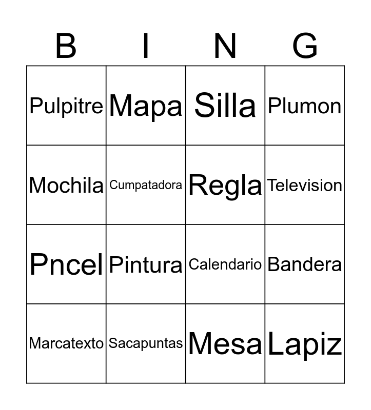 This bingo card has a free space and 15 words: Marcatexto, Lapiz, Silla, Pulpitre, Television, Mochila, Pintura, Mesa, Cumpatadora, Pncel, Bandera, Plumon, Regla, Mapa and Sacapuntas.
