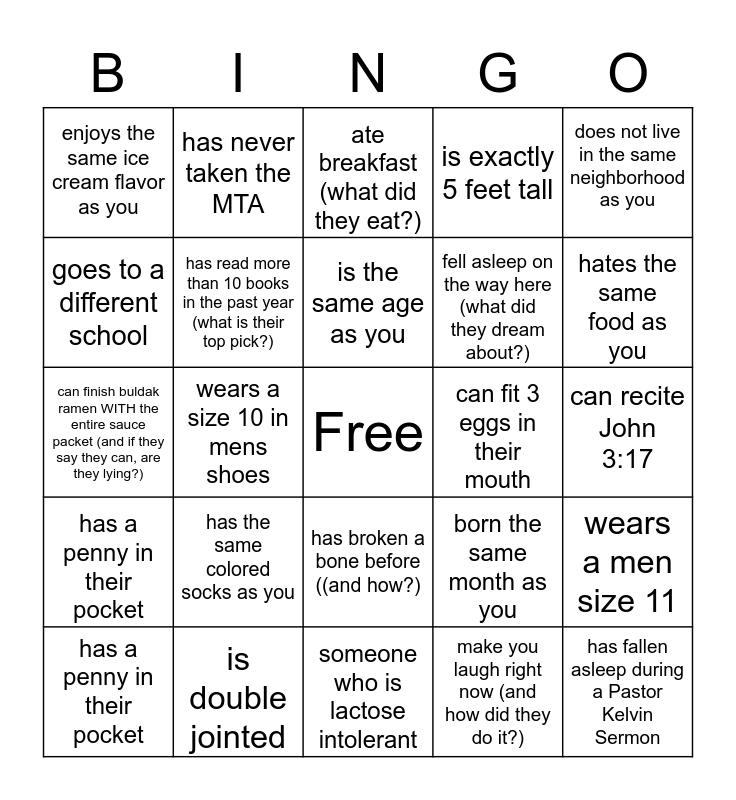 This bingo card has a free space and 30 words: is double jointed, never had a cavity, wears a size 10 in mens shoes, can name the powerhouse of the cell, enjoys the same ice cream flavor as you, ate breakfast (what did they eat?), has read more than 10 books in the past year (what is their top pick?), has broken a bone before ((and how?), can fit 3 eggs in their mouth, someone who is lactose intolerant, can recite John 3:17, has fallen asleep during a Pastor Kelvin Sermon, make you laugh right now (and how did they do it?), wears a size 7 in women’s shoes, hates the same food as you, has the most instagram followers, born the same month as you, has a penny in their pocket, has the same colored socks as you, does not live in the same neighborhood as you, can finish buldak ramen WITH the entire sauce packet (and if they say they can, are they lying?), can type more than 70 words per minute, has never taken the MTA, fell asleep on the way here (what did they dream about?), goes to a different school, is exactly 5 feet tall, wears a men size 11, has a penny in their pocket, is the same age as you and can recite John 3:17.