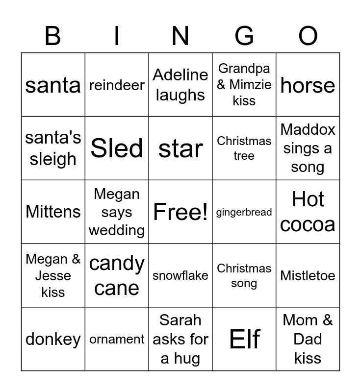 This bingo card has a free space and 24 words: candy cane, ornament, star, donkey, horse, santa, santa's sleigh, reindeer, gingerbread, snowflake, Christmas tree, Mittens, Christmas song, Mistletoe, Sled, Elf, Hot cocoa, Adeline laughs, Maddox sings a song, Megan says wedding, Mom & Dad kiss, Megan & Jesse kiss, Grandpa & Mimzie kiss and Sarah asks for a hug.