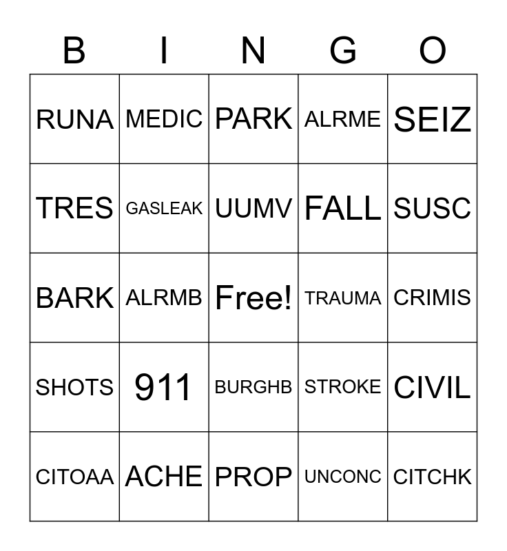 This bingo card has a free space and 24 words: 911, ACHE, UUMV, CITOAA, SEIZ, RUNA, TRES, MEDIC, TRAUMA, BURGHB, FALL, BARK, STROKE, CIVIL, GASLEAK, UNCONC, CRIMIS, PARK, SUSC, ALRMB, CITCHK, SHOTS, ALRME and PROP.