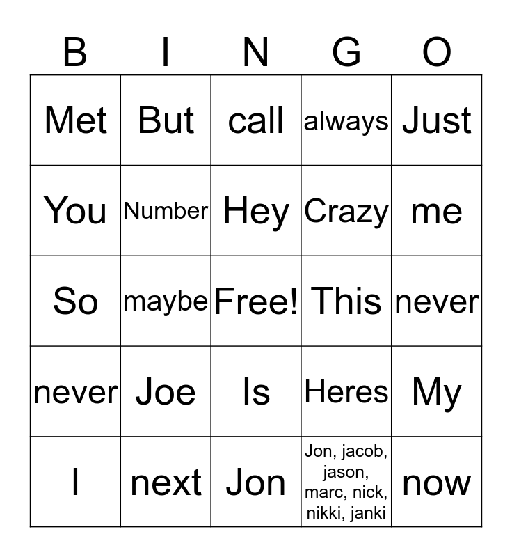 This bingo card has a free space and 25 words: Joe, Jon, Hey, I, Just, Met, You, But, This, Is, Crazy, So, Heres, My, Number, but, never, call, me, maybe, now, next, never, always and Jon, jacob, jason, marc, nick, nikki, janki.