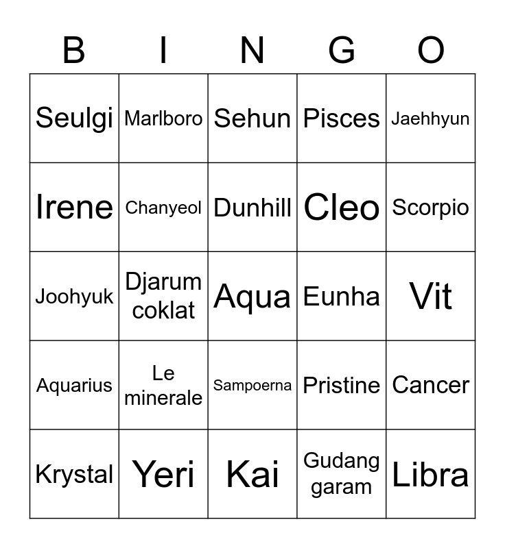 This bingo card has a free space and 24 words: Le minerale, Yeri, Dunhill, Krystal, Jaehhyun, Seulgi, Irene, Marlboro, Eunha, Sampoerna, Cleo, Joohyuk, Pristine, Cancer, Chanyeol, Gudang garam, Vit, Sehun, Scorpio, Djarum coklat, Libra, Aquarius, Pisces and Kai.