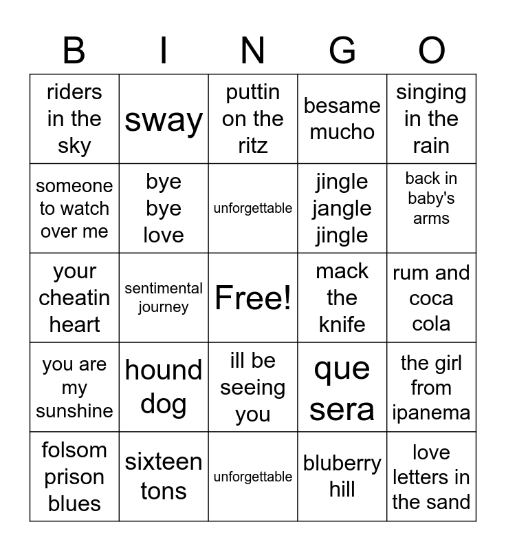 This bingo card has a free space and 64 words: walk the line, blue suede shoes, let me call you sweetheart, the girl from ipanema, beyond the sea, summer wind, sway, cheek to cheek, unforgettable, moon river, ill be seeing you, over the rainbow, rum and coca cola, singing in the rain, moonlight serenade, someone to watch over me, sentimental journey, riders in the sky, don't fence me in, jingle jangle jingle, hound dog, you are my sunshine, besame mucho, buttons and bows, love me tender, thats amore, chances are, all i have to do is dream, smoke gets in your eyes, crazy he calls me, the nearness of you, god bless america, pennsylvania polka, crazy, back in baby's arms, folsom prison blues, unchained melody, bluberry hill, mona lisa, bye bye love, your cheatin heart, mack the knife, a bushel and a peck, happy trails, hey good lookin, love letters in the sand, sixteen tons, honeycomb, que sera, smoke gets in your eyes, peggy sue, release me, unforgettable, you belong to me, tea for two, i got rhythm, puttin on the ritz, precious lord take my hand, minnie the moocher, stormy weather, thanks for the memory, blue moon, alexanders rag time band and beer barrel polka.