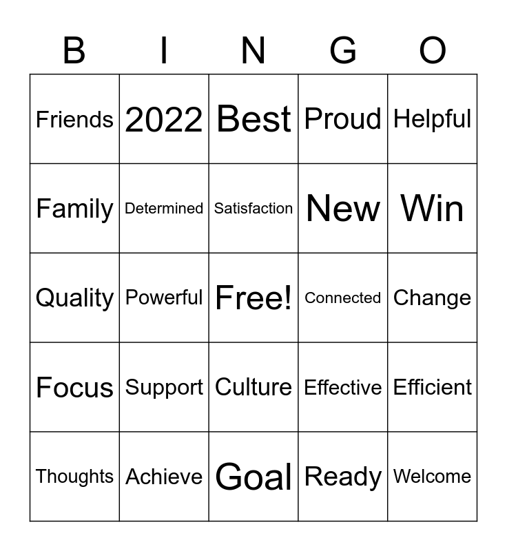 This bingo card has a free space and 25 words: Support, Goal, Satisfaction, Thoughts, Helpful, Friends, Family, 2022, Connected, Culture, New, Quality, Effective, Efficient, Determined, Inclusive, Change, Best, Win, Powerful, Welcome, Achieve, Focus, Proud and Ready.