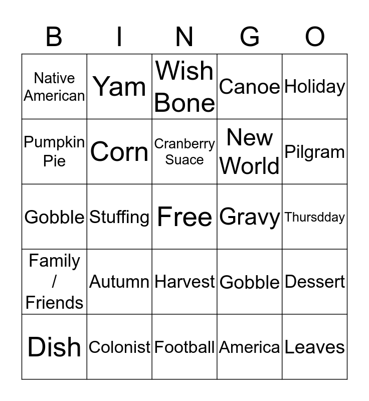 This bingo card has a free space and 24 words: Autumn, Colonist, Cranberry Suace, Dish, Holiday, Native American, Pumpkin Pie, Yam, Gravy, Harvest, New World, Gobble, Gobble, Dessert, Corn, America, Thursdday, Wish Bone, Pilgram, Stuffing, Leaves, Family / Friends, Canoe and Football.