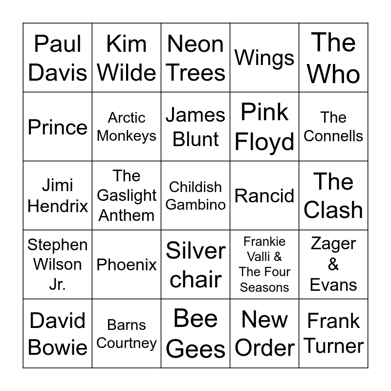 This bingo card has 49 words: The Smashing Pumpkins, Childish Gambino, The Wombats, Bee Gees, Phoenix, Bowling For Soup, Kim Wilde, Pulp, Prince, Hilltop Hoods, Arctic Monkeys, Wings, Zager & Evans, Frankie Valli & The Four Seasons, Eurythmics, Charli XCX, James Blunt, Rancid, Bryan Adams, The Who, The Gaslight Anthem, New Order, Paul Davis, Pink Floyd, The Stooges, The Connells, David Bowie, Spirit, Silver chair, Stephen Wilson Jr., Randy Newman, Busted, Sublime, Vampire Weekend, Barns Courtney, Bruises, The Vines, Afro man, The Clash, Passion Pit, Azealia Banks, Gorillaz, Frank Turner, Meek Mill, Jimi Hendrix, Neon Trees, 5 Seconds of Summer, They Might Be Giants and The Gizmos.