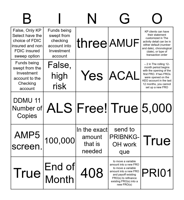 This bingo card has a free space and 24 words: 100,000, End of Month, Yes, True, KP clients can have their statement customized in The activity detail can be in either default (number and date), chronological (date), or type of transaction order, False, Only KP Select have the choice of FDIC insured and non FDIC insured sweep option, Funds being swept from the Investment account to the Checking account, Funds being swept from checking account into Investment account, True, In the exact amount that is needed, ACAL, DDMU 11 Number of Copies, send to PRIBNKG-OH work que, True, False, high risk, to move a variable amount into a new FRO to move a variable amount into a new FRO and payoff existing FRO(s) to refinance existing FRO(s) into a new FRO(s), 5,000, three, – 2 in The rolling 12-month period begins with the opening of the first FRO. If two FROs were opened on the KEO account in the last 12 months, you cannot set up a new FRO, ALS, PRI01, AMP5 screen., AMUF and 408.