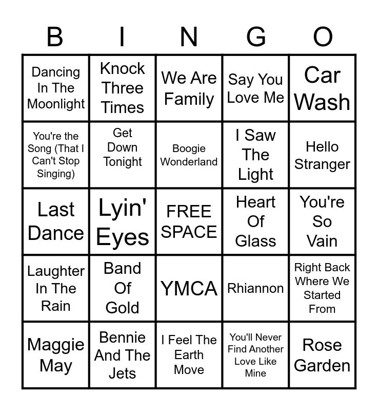 This bingo card has 40 words: Listen To What The Man Said, Last Dance, Dancing Queen, Get Down Tonight, Bennie And The Jets, YMCA, Boogie Wonderland, I'm Every Woman, Car Wash, Laughter In The Rain, Lyin' Eyes, Say You Love Me, FREE SPACE, You're So Vain, Heart Of Glass, Band Of Gold, Young Hearts Run Free, Dancing In The Moonlight, The Hustle, We Are Family, Right Back Where We Started From, You'll Never Find Another Love Like Mine, I Saw The Light, You're the Song (That I Can't Stop Singing), Isn't She Lovely, More Than A Woman, There's A Kind Of Hush, Hopelessly Devoted To You, Rose Garden, I'll Be There, Everlasting Love, Maggie May, Vienna, Rhiannon, Hello Stranger, I Feel The Earth Move, If I Can't Have You, You Don't Have to Be a Star (To Be In My Show), Knock Three Times and I'll Go Where Your Music Takes Me.