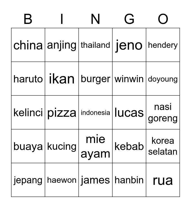 This bingo card has a free space and 24 words: kucing, haewon, burger, jepang, hendery, china, haruto, anjing, lucas, mie ayam, winwin, kelinci, kebab, korea selatan, ikan, hanbin, nasi goreng, thailand, doyoung, pizza, rua, buaya, jeno and james.