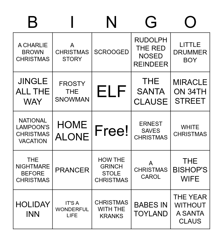 This bingo card has a free space and 29 words: HOLIDAY INN, FAMILY MAN, HOME ALONE, A CHRISTMAS STORY, A CHARLIE BROWN CHRISTMAS, SCROOGED, FROSTY THE SNOWMAN, PRANCER, ERNEST SAVES CHRISTMAS, IT'S A WONDERFUL LIFE, WHITE CHRISTMAS, THE YEAR WITHOUT A SANTA CLAUS, CHRISTMAS WITH THE KRANKS, BABES IN TOYLAND, MIRACLE ON 34TH STREET, JACK FROST, HOW THE GRINCH STOLE CHRISTMAS, THE NIGHTMARE BEFORE CHRISTMAS, LITTLE DRUMMER BOY, NATIONAL LAMPOON'S CHRISTMAS VACATION, A CHRISTMAS CAROL, THE POLAR EXPRESS, THE SANTA CLAUSE, JINGLE ALL THE WAY, RUDOLPH THE RED NOSED REINDEER, A CHRISTMAS STORY, THE BISHOP'S WIFE, ELF and THE CHRISTMAS CHRONICLES.