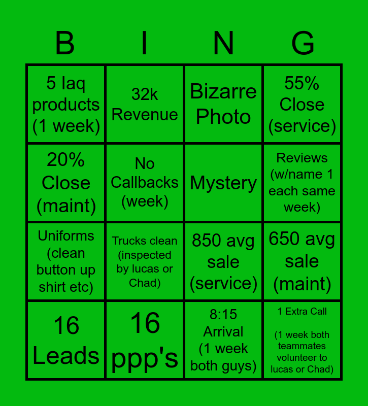 This bingo card has 16 words: 16 Leads, 16 ppp's, Bizarre Photo, 55% Close (service), 20% Close (maint), 32k Revenue, 850 avg sale (service), 650 avg sale (maint), 5 Iaq products (1 week), No Callbacks (week), 8:15 Arrival (1 week both guys), Reviews (w/name 1 each same week), Uniforms (clean button up shirt etc), Trucks clean (inspected by lucas or Chad), Mystery and 1 Extra Call (1 week both teammates volunteer to lucas or Chad).