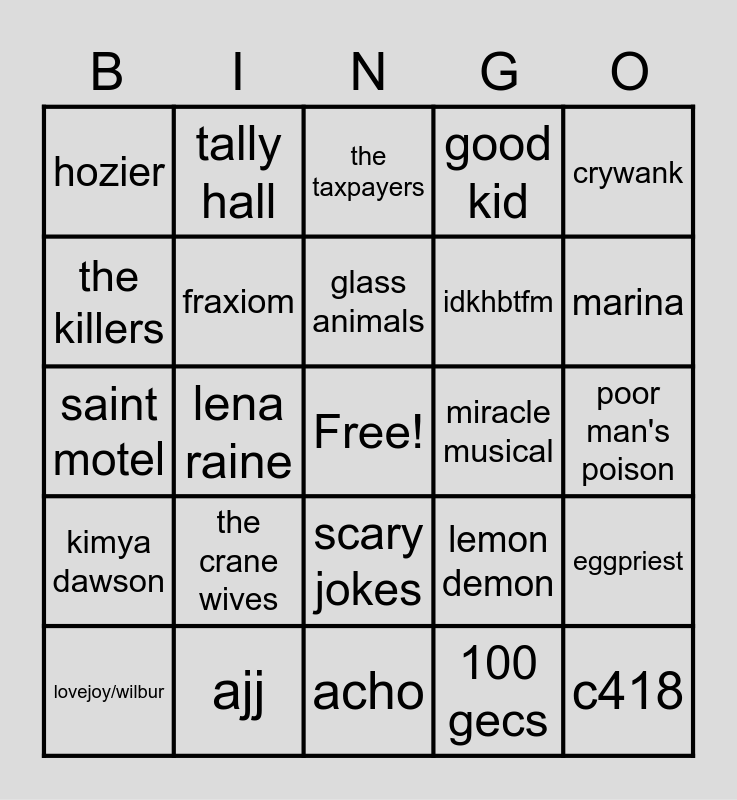 This bingo card has a free space and 24 words: the crane wives, ajj, glass animals, lovejoy/wilbur, crywank, hozier, the killers, tally hall, miracle musical, scary jokes, idkhbtfm, saint motel, lemon demon, eggpriest, fraxiom, 100 gecs, poor man's poison, the taxpayers, marina, lena raine, c418, kimya dawson, good kid and acho.
