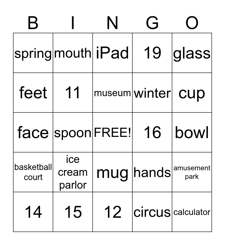 This bingo card has a free space and 42 words: theater, museum, planetarium, ice cream parlor, circus, amusement park, calculator, cell phone, iPad, mug, bowl, cup, spoon, glass, eyes, hands, ears, face, nose, mouth, feet, fingers, toes, spring, summer, fall, winter, swimming pool, table tennis table, soccer field, gym, basketball court, 11, 12, 13, 14, 15, 16, 17, 18, 19 and 20.