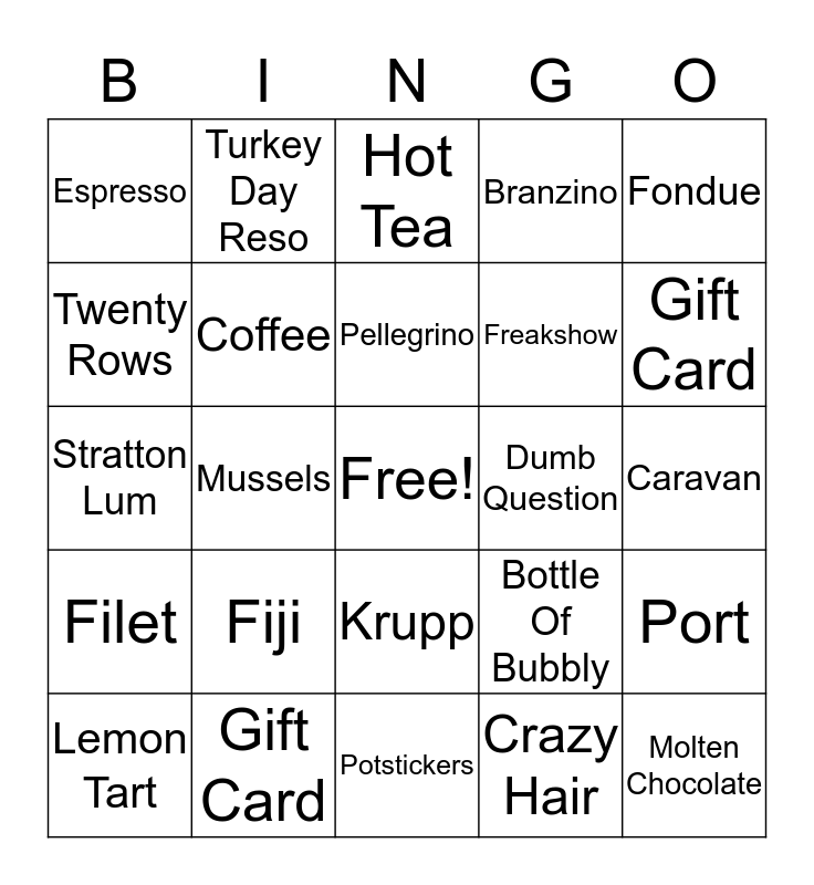 This bingo card has a free space and 24 words: Fiji, Gift Card, Pellegrino, Lemon Tart, Fondue, Espresso, Twenty Rows, Turkey Day Reso, Dumb Question, Krupp, Freakshow, Stratton Lum, Bottle Of Bubbly, Port, Coffee, Crazy Hair, Caravan, Hot Tea, Gift Card, Mussels, Molten Chocolate, Filet, Branzino and Potstickers.