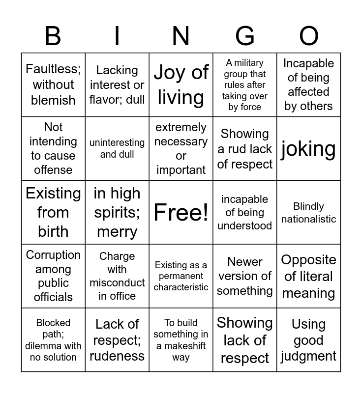 This bingo card has a free space and 24 words: Charge with misconduct in office, Lack of respect; rudeness, extremely necessary or important, Blocked path; dilemma with no solution, Incapable of being affected by others, Faultless; without blemish, Not intending to cause offense, Lacking interest or flavor; dull, incapable of being understood, Existing as a permanent characteristic, Showing a rud lack of respect, Existing from birth, Newer version of something, Opposite of literal meaning, uninteresting and dull, Showing lack of respect, Blindly nationalistic, Joy of living, joking, in high spirits; merry, Using good judgment, Corruption among public officials, A military group that rules after taking over by force and To build something in a makeshift way.