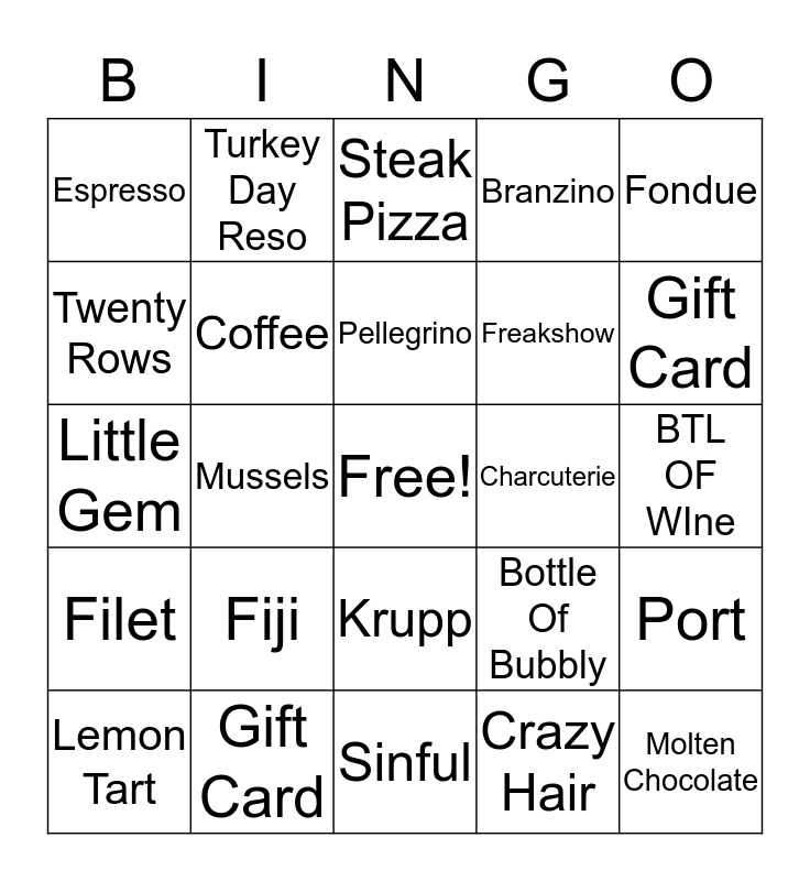 This bingo card has a free space and 24 words: Fiji, Gift Card, Pellegrino, Lemon Tart, Fondue, Espresso, Twenty Rows, Turkey Day Reso, Charcuterie, Krupp, Freakshow, Little Gem, Bottle Of Bubbly, Port, Coffee, Crazy Hair, BTL OF WIne, Steak Pizza, Gift Card, Mussels, Molten Chocolate, Filet, Branzino and Sinful.
