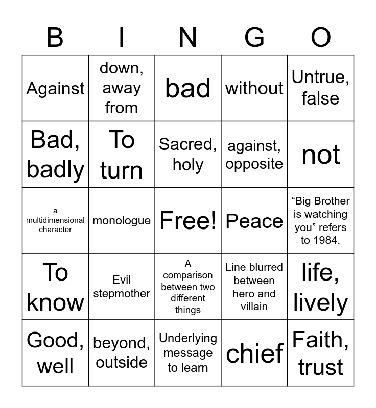 This bingo card has a free space and 59 words: Wrong, ill, not, beyond, outside, good, well, beautiful, To know, chief, Sound, To turn, for, before, in front of, against, opposite, above, excessive, without, Apart, not, Bad, badly, out of, from, off, Under, Against, Faith, trust, Untrue, false, wise, wisdom, Sacred, holy, Peace, bad, Good, well, life, lively, Death, die, War, color, man, not, Away, from, Not, against, city, beyond, excess, down, away from, To write, You're hot, then you're cold, monologue, the lion on The Lion, Witch, and the Wardrobe represents Jesus, a multidimensional character, changes/develops in the course of the story, Evil stepmother, “Big Brother is watching you” refers to 1984., a rhyme involving a word in the middle of, a rhyme in the middle of a word or line, true lies, Words made from the letters of other words, providing relief from, strong or repressed emotions, A comparison between two different things, Underlying message to learn, showing future events and then going, back to present tense in a story, A character that does not change or develop, Dr. Jekyll & Mr. Hyde, Different outcome than expected, Line blurred between hero and villain, sarcasm, Going back in time in a story to explain and Reader is aware but character isn’t.