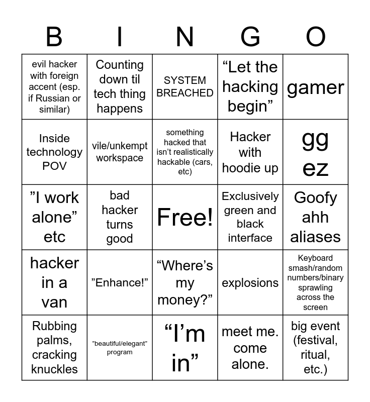 This bingo card has a free space and 27 words: explosions, unearned kissing (or further) scene, Hacker with hoodie up, “I’m in”, Inside technology POV, SYSTEM BREACHED, Counting down til tech thing happens, hacker in a van, Exclusively green and black interface, Keyboard smash/random numbers/binary sprawling across the screen, ”I work alone” etc, “Let the hacking begin”, Rubbing palms, cracking knuckles, ”beautiful/elegant” program, gg ez, “In English please?” (hacker has to dumb down what they’re saying for someone else because they got too tech-y), vile/unkempt workspace, something hacked that isn’t realistically hackable (cars, etc), ”Enhance!”, evil hacker with foreign accent (esp. if Russian or similar), Goofy ahh aliases, meet me. come alone., bad hacker turns good, big event (festival, ritual, etc.), “Where’s my money?”, gamer and missing motive.