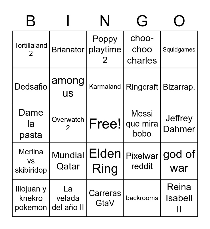 This bingo card has a free space and 24 words: Mundial Qatar, La velada del año II, Karmaland, Illojuan y knekro pokemon, Squidgames, Tortillaland 2, Dedsafio, Brianator, Messi que mira bobo, Elden Ring, Ringcraft, Dame la pasta, Pixelwar reddit, god of war, among us, backrooms, Jeffrey Dahmer, Poppy playtime 2, Bizarrap., Overwatch 2, Reina Isabell II, Merlina vs skibiridop, choo-choo charles and Carreras GtaV.