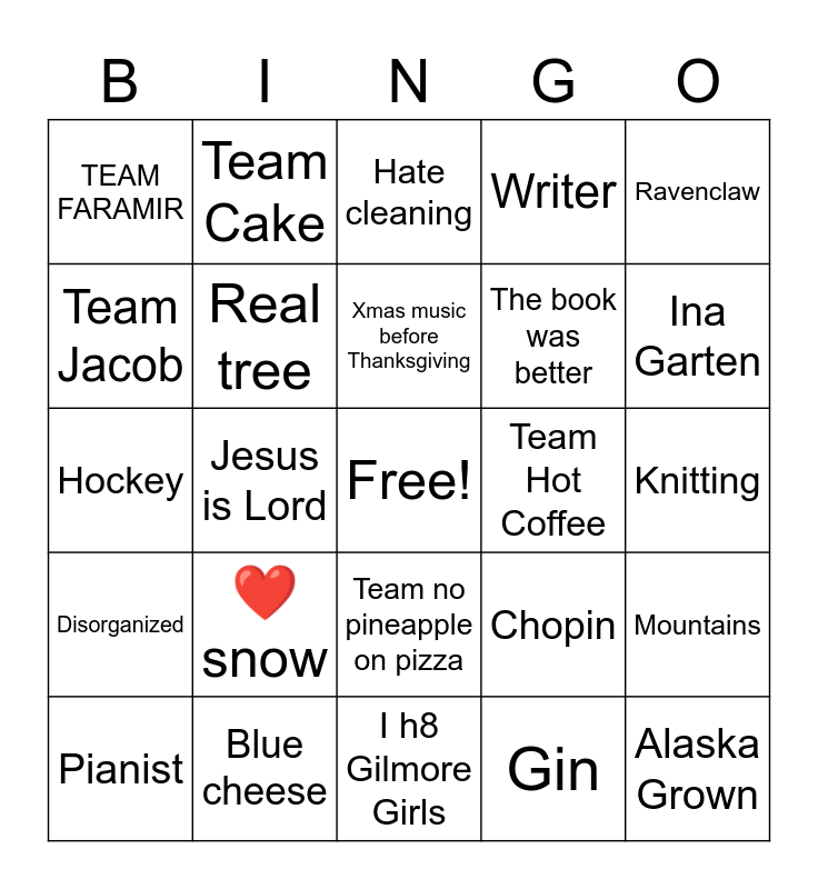 This bingo card has a free space and 24 words: ❤️ snow, Blue cheese, Xmas music before Thanksgiving, Pianist, Ravenclaw, TEAM FARAMIR, Team Jacob, Team Cake, Team Hot Coffee, Team no pineapple on pizza, The book was better, Hockey, Chopin, Mountains, Real tree, Gin, Knitting, Hate cleaning, Ina Garten, Jesus is Lord, Alaska Grown, Disorganized, Writer and I h8 Gilmore Girls.