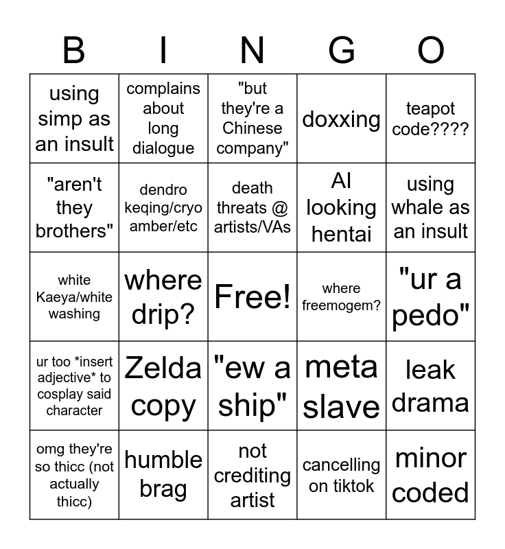 This bingo card has a free space and 24 words: Zelda copy, humble brag, death threats @ artists/VAs, omg they're so thicc (not actually thicc), teapot code????, using simp as an insult, "aren't they brothers", complains about long dialogue, where freemogem?, "ew a ship", AI looking hentai, white Kaeya/white washing, meta slave, leak drama, dendro keqing/cryo amber/etc, cancelling on tiktok, "ur a pedo", "but they're a Chinese company", using whale as an insult, where drip?, minor coded, ur too *insert adjective* to cosplay said character, doxxing and not crediting artist.